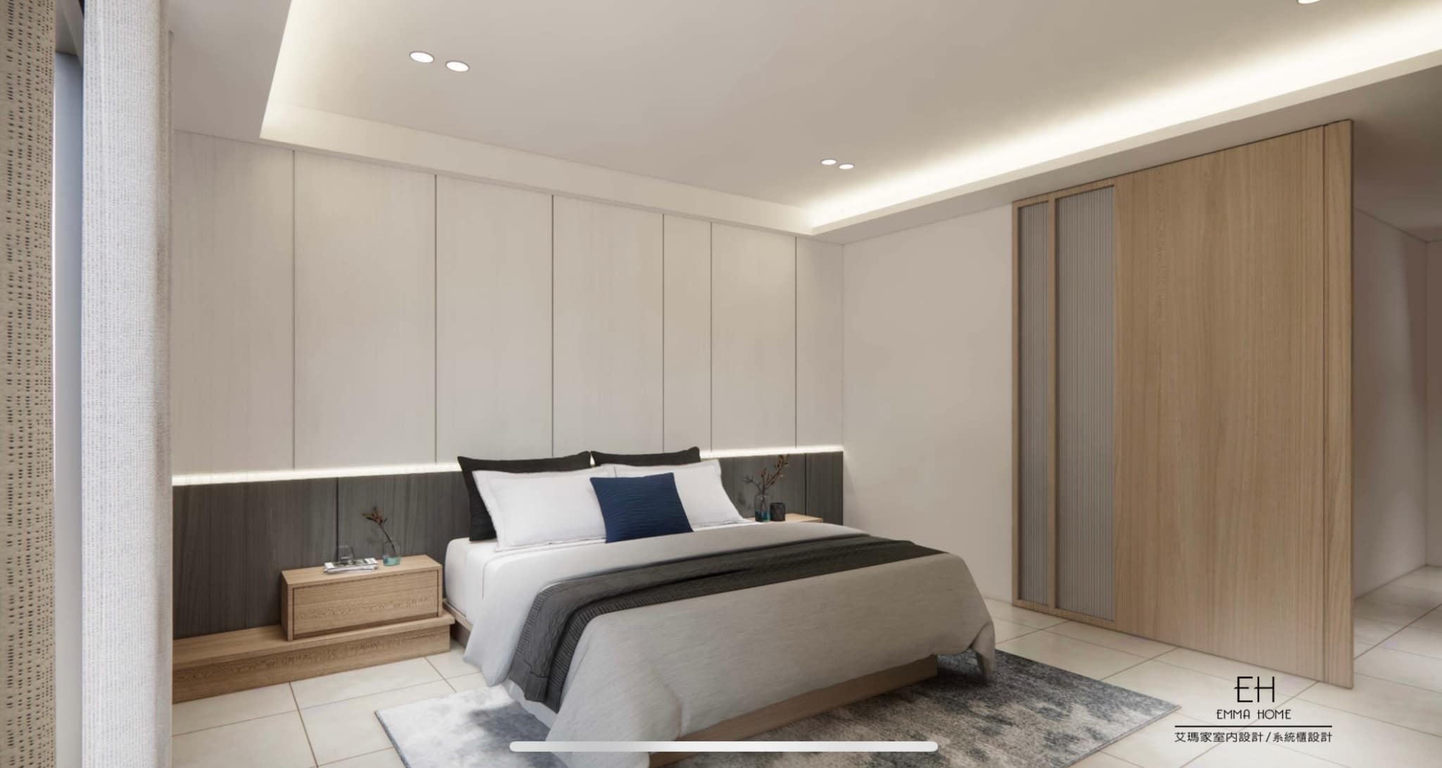 床頭以低調灰與暖白做搭配,