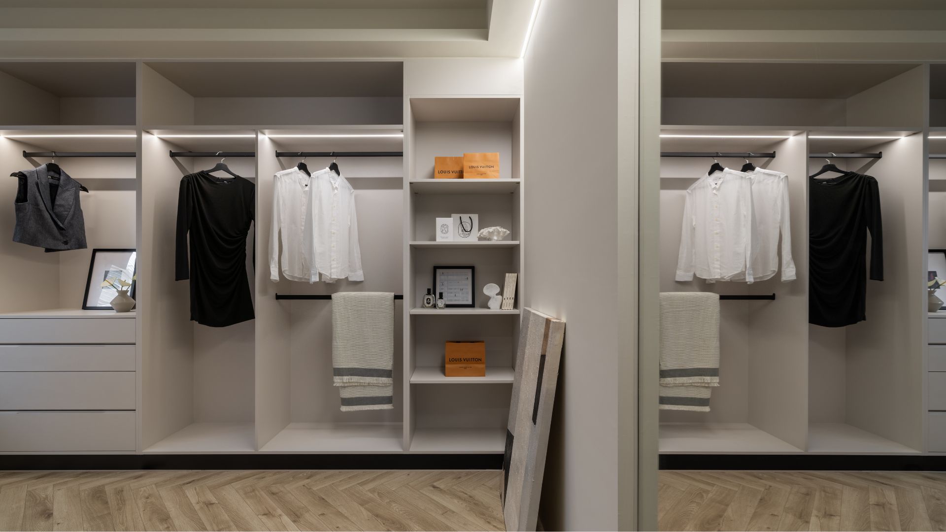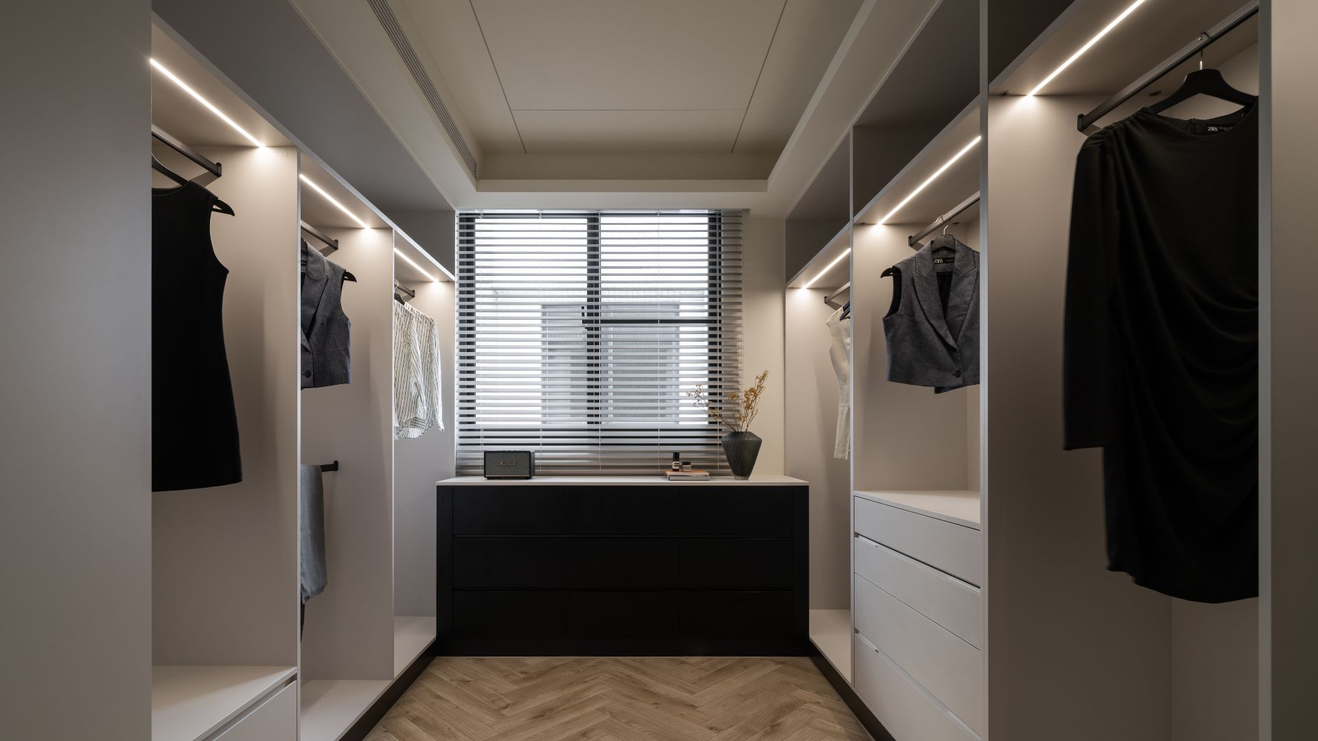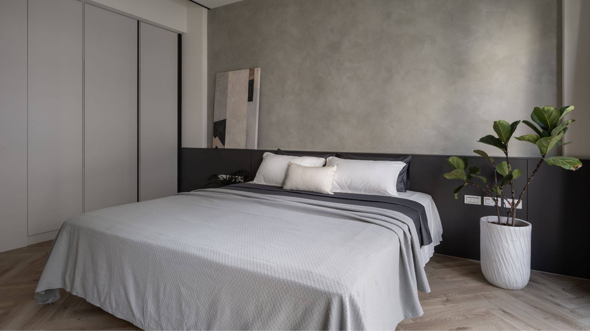 半腰灰的特殊塗料牆與白色系衣櫃對話,