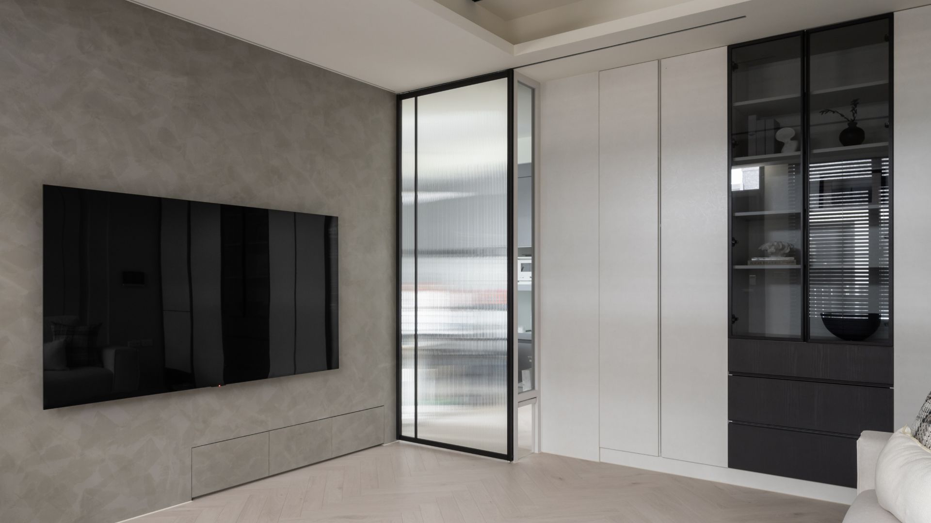 天花的隱藏燈槽、懸掛式電視牆與材質交錯設計,