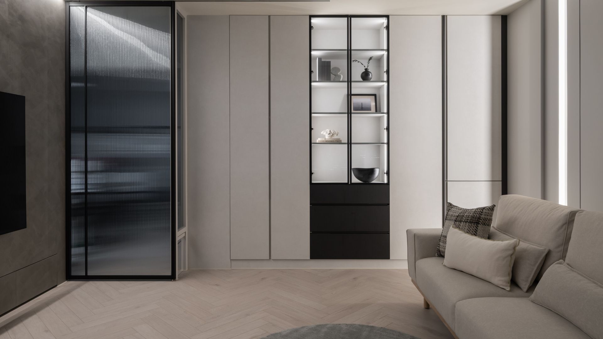 整面由系統櫃打造的櫃體牆,灰與黑的層次像是一段節奏感的低語。