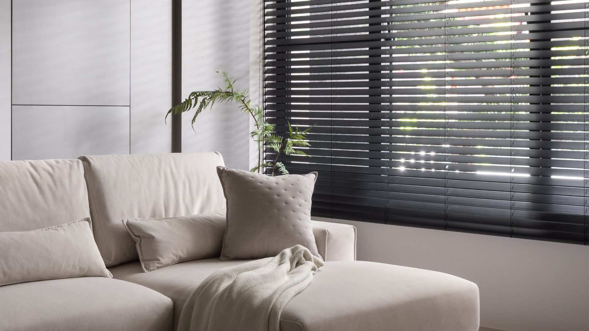 落地窗將日光灑進室內,灰階牆面與百葉窗堆疊出光影的表情,